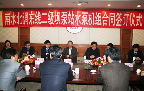 3月12日,南水北調(diào)東線一期工程二級壩泵站簽字儀式在山東省濟南頤正大廈隆重舉行;山東省水利廳領(lǐng)導(dǎo)、淄博市領(lǐng)導(dǎo)及荏原博泵李正民副總帶隊參加了簽字儀式。荏原博泵在南水北調(diào)主線泵站中標(biāo),標(biāo)志著我公司大型泵的制造將有新的突破。