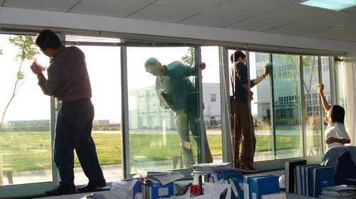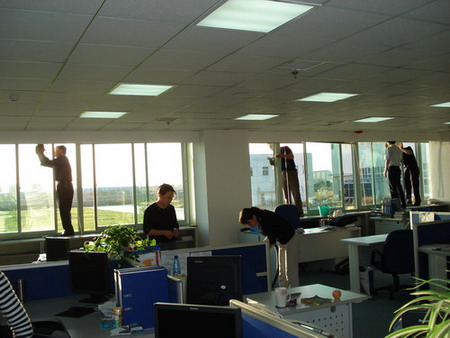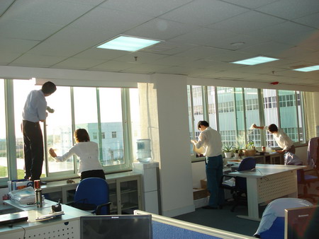 業(yè)務技術黨支部共32人參加勞動,支部書記梁文運與支委們首先對負責清理的二樓、四樓場所及會議室的窗戶和地面進行了詳細分工,使大家在有限的時間內有條不紊的進行。特別是二樓只有13人參加勞動,衛(wèi)生清理工作量比較大,但大家都沒有任何怨言。在勞動中,鄭素紅、房凝、徐寶紅、牛愛香四位女同志連續(xù)工作一個半小時打掃了二樓的所有辦公室和會議室的地面。李正民副總和李同華副總率先帶頭擦起了窗戶,在擦完窗戶后大家又把所有的窗臺和地面的衛(wèi)生死角清理了一遍。