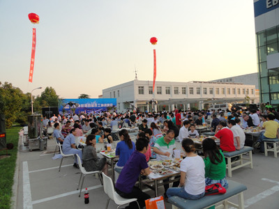 24日下午,公司辦公樓前,擺放著一排排桌椅,員工們從餐廳端著盛滿豐盛食物的餐盤,擺放在餐桌上。南面的舞臺上,工作人員在緊張的調試音響,兩只紅色的氫氣球飄揚在空中,在蔚藍的天空映襯下,格外的鮮艷,為整個會場增添了喜慶的氣氛。