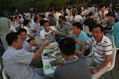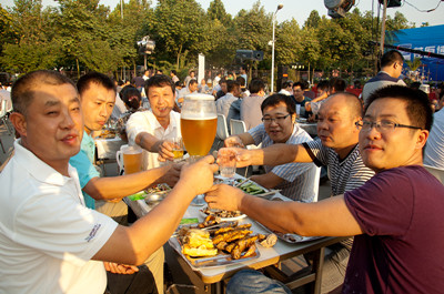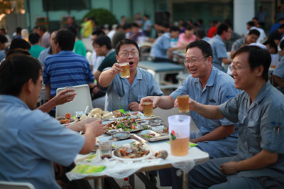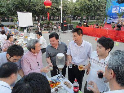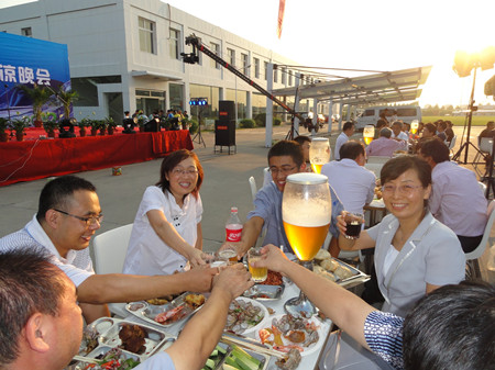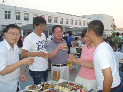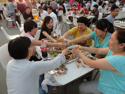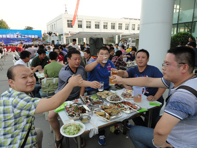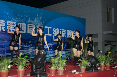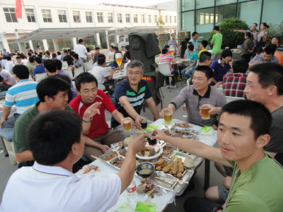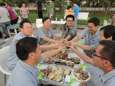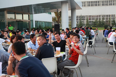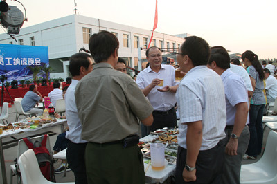 17:30分, “第四屆員工納涼晚會”正式開始。首先是員工聚餐。近400名員工,伴著歡快的樂曲聲,推杯換盞,大快朵頤。公司總經理志賀進、常務副總經理王正軍等公司領導走入員工中,與員工們親切交談,敬酒祝愿,整個會場洋溢著一張張歡樂的笑臉。